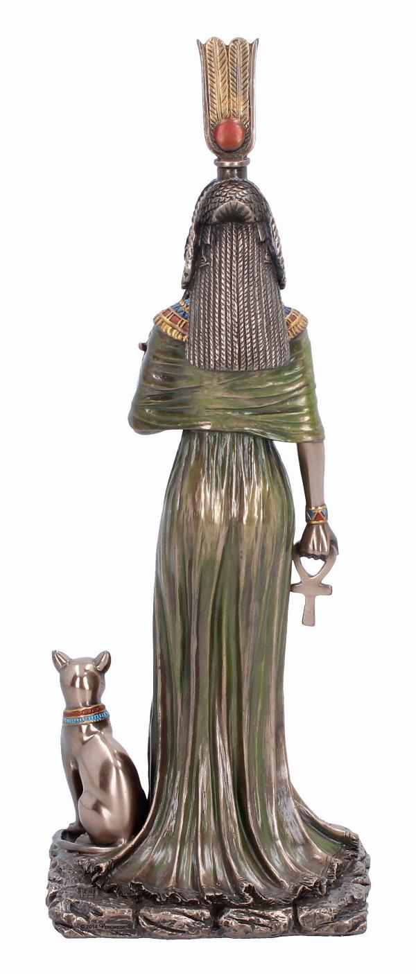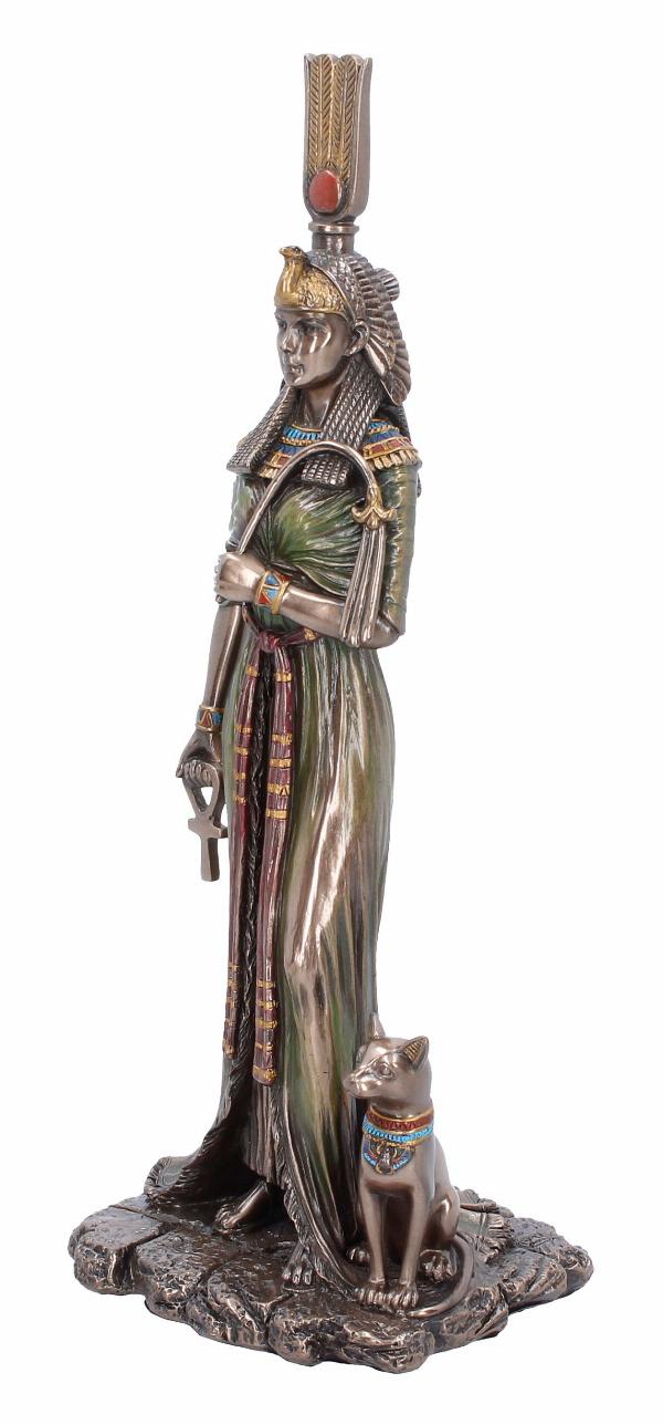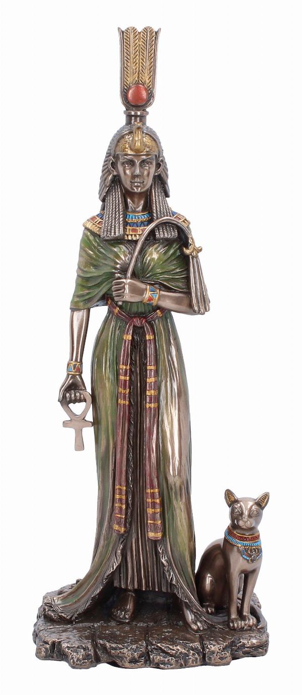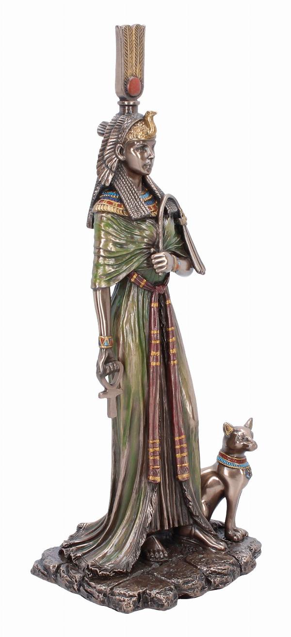 - Rich dark bronze finish, intricate detailing throughout her royal garments and headdress, and a loyal cat companion at her side, symbolising protection and divinity.