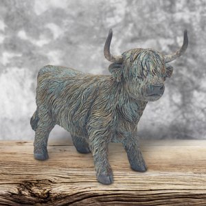 Powerful statue of a Highland Cow. Solid Cold cast resin with golden bronze finish. Good display size.