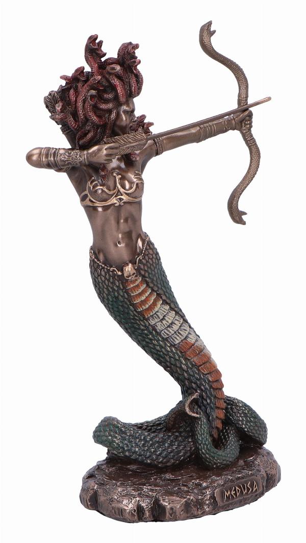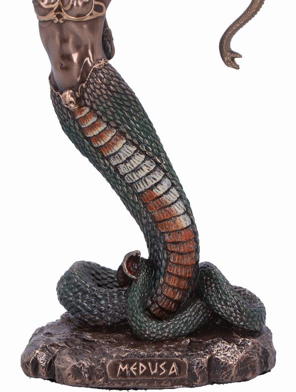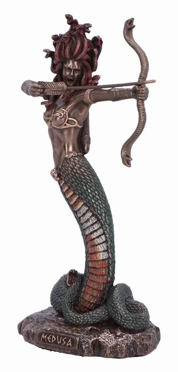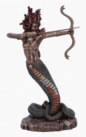 Enter the realm of Greek Mythology with our striking Medusa figurine, capturing the tragic beauty of the legendary Gorgon. Crafted with meticulous detail, this resin masterpiece features a polished bronze finish, accentuated by vibrant coloured details. With a human upper body and serpent's lower body, Medusa strikes a fearsome pose, her hissing snakes ready to strike. From Nemesis Now's esteemed Mythology range, this figurine captivates with its timeless narrative and exquisite craftsmanship, appealing to fantasy enthusiasts and collectors alike.