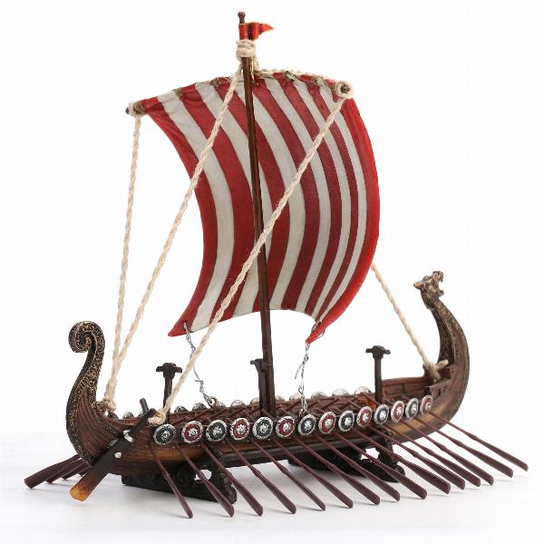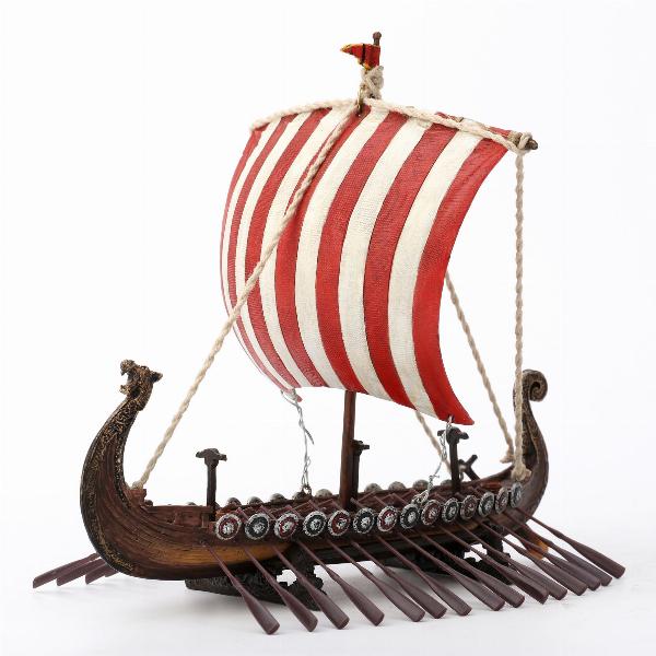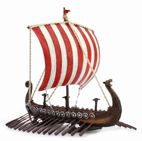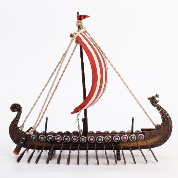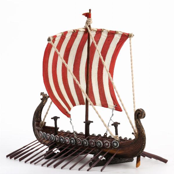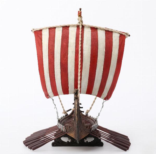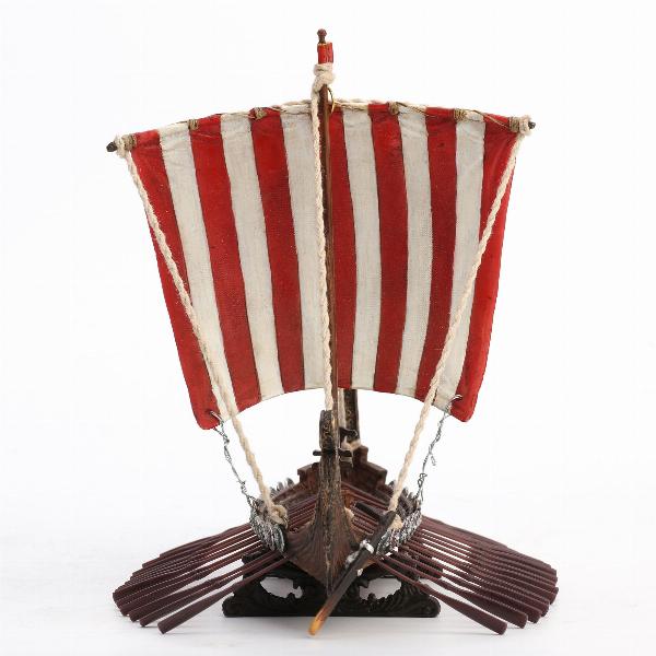 This meticulously crafted depiction of a Viking ship evokes the formidable maritime prowess of the Norse seafarers from the late eighth to the early eleventh century. The bold red and white striped sail serves as a striking reminder of the ships that once traversed the North Atlantic, voyaging towards conquests and discoveries. This model encapsulates the spirit of exploration and adventure that characterized the Viking era, a time when these intrepid explorers established trade routes and settlements across Europe, and even reached the shores of North America. The intricate detailing of the ship's prow, reminiscent of the dragon-headed longships, embodies themes of mythology, power, and the enduring legacy of the Vikings in maritime history.
